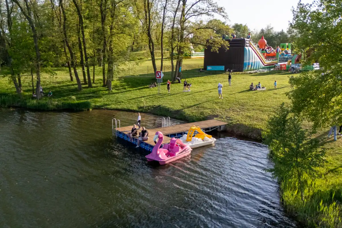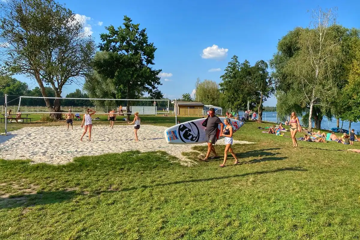 Užijte si rozsáhlou vodní plochu s písčitým dnem, ideální pro všestrannou rekreaci. Vyberte si mezi pohodlným dřevěným molem a travnatou pláží s pozvolným vstupem. Nabízíme půjčovnu šlapadel se skluzavkou a paddleboardů, a pro sportovce tu jsou hřiště na plážový volejbal a pétanque. U nás najdete i občerstvení, venkovní sprchy a toalety pro váš komfort. Přijďte si užít perfektní den u vody!
